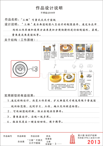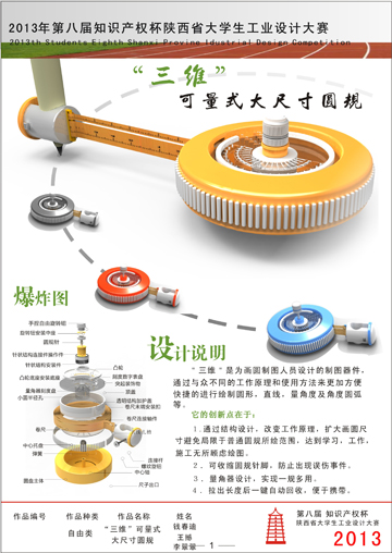 钱春迪从去年三月就开始着手准备,由于设计所涉及的知识超出了自己的专业领域,所以她一方面向机械专业的同学请教,一方面查阅相关资料,并听取了老师宝贵的建议。所设计的“三维”可量式大尺寸圆规摒弃了传统的圆规设计理念,将直尺、量角器和圆规的融为一体后进行了结构改良和创新,作品的优点是可以一物三用,摆脱了传统工具的测量局限,解决了现有圆规因脚针松动导致绘图不精确且功能单一的问题,并可实现大圆以及角度圆弧的绘制,同时具有测量角度的功能,通过拉伸卷尺使用更加方便,卷尺自动收缩在中间可以有效地美观的存放,使用后只需旋转收回圆规针可避免不必要的伤害。