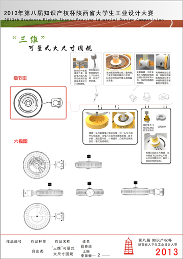 钱春迪,艺术与设计学院设计学研1326班的学生,她设计的“三维”可量式大尺寸圆规在2013年10月第八届知识产权杯陕西省大学生工业设计大赛中获得了二等奖。