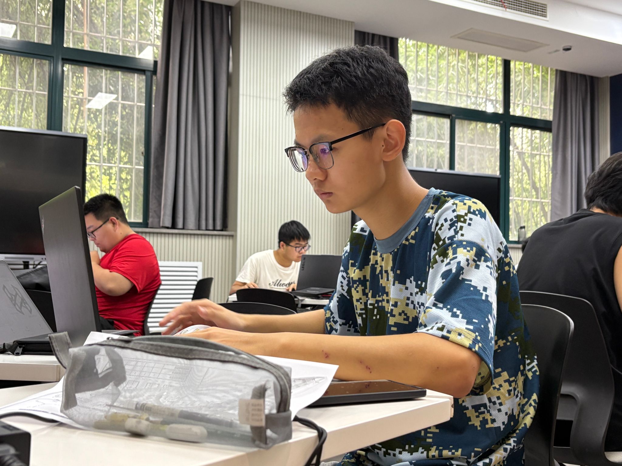 剩余半个月时间,我们申请留校,导员给予我鼓励与关心,并嘱咐我要注意安全与健康。指导老师指出训练当中的问题,并且针对性的对我们存在的问题做出讲解并给予建议,投入之多,远多于我。不是一个人在战斗,自己也便更认真的备战。那时我们的日常大多是宿舍,食堂,教室“三点一线”。不怕别人能力比你强,就怕能力比你强的人比你还努力。队伍中的学长们尝尝训练到后半夜,一次太晚回宿舍楼,没有人应门,便在教室住了一晚。这种良好的对内竞争激励着每个人。我也曾因为太晚没法进宿舍,而到综南楼趴了一晚。