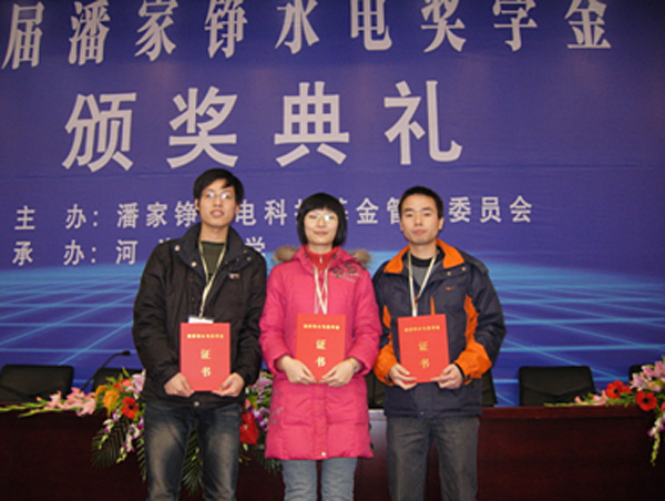 相关背景:潘家铮水电奖学金是为了弘扬潘家铮先生“忠诚敬业、求实创新”的精神,为奖励热爱祖国水利水电事业、品学兼优、勇于创新的本科生和研究生特别设立的,奖励包括清华大学、中国水利水电科学研究院及我共13个院校,每年奖励25名在校本科生和15名在读研究生。首届潘家铮水电奖学金颁奖仪式于2009年12月21日在河海大学举行。潘家铮水电科技基金管理委员会相关负责人及中国水利水电科学研究院、南京水利科学研究院、国网电力科学研究院等科研单位相关负责人出席了典礼,我校获奖学生姜仁贵、杨研和陈演在老师刘小丽的带领下参加了颁奖仪式。