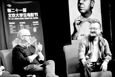 4月28日,第21届北京大学生电影节举办电影大师面对面活动,图为美国知名电影人詹姆士·沙姆斯(左)同中国导演乌尔善与大学生开展电影文化交流。新华社记者 金良快摄