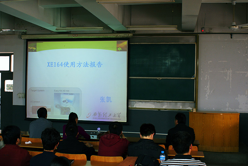 本次讲座分别由上届大赛全国一等奖获得者张凯以及张鹏程主讲。张凯就Infineon 16位单片机XE164的结构,编程、下载、调试等使用方法以及注意事项等内容做了详细介绍;张鹏程介绍了Infineon 8位单片机XC866,讲解了单片机的初始化配置环境、Wave800、Keil软件的编程方法以及下载调试方法等内容。培训会后,两位主讲人对各参赛队员关心的问题做了详细解答。