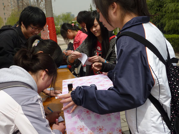 4月1日中午,水利水电学院于主干道以“寄送心愿”的形式收集理工学子对灾区同胞的真心祝愿。晚七点,他们在教室观看视频及相关图片并展开讨论及总结。此次活动中,同学们积极参与,踊跃发言,表达出对灾区人民的关怀、对生活的感恩以及强烈的民族意识和爱国热情。