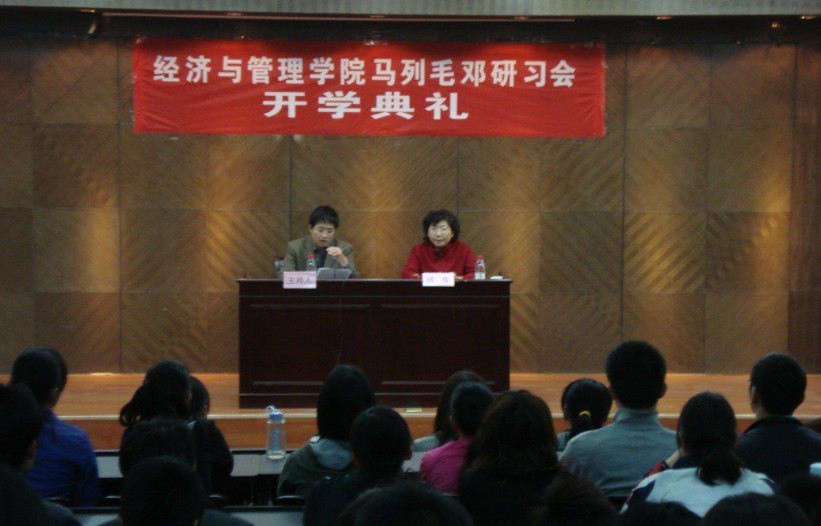 本报讯 4月1日,经济与管理学院于曲江校区模拟法庭举办了第38期“马列毛邓研习会开学典礼”。校党委副书记杨萍作的形势政策报告,院党委副书记岳新利老师主持,09-07级学生党员共230余人也参加了典礼。