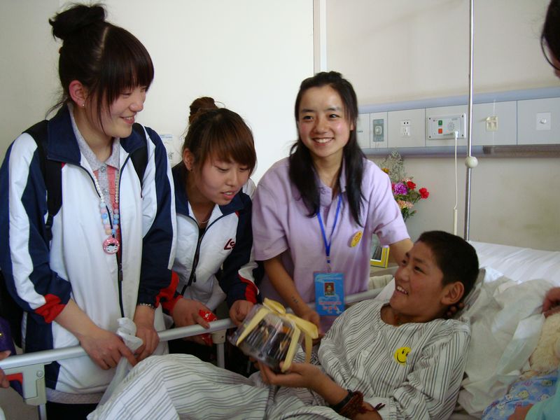同学们去看望受灾同胞,受到了医院领导的热情接待。同学们带着自己精心准备的礼物送给玉树代表索昂昂布,即将出院的小伤员阿义毛周看着同学们给她带来的小礼物高兴地与同学们唱起歌来。据医生介绍,这是她入院以来第一次唱歌。