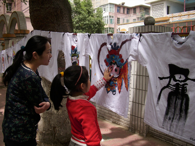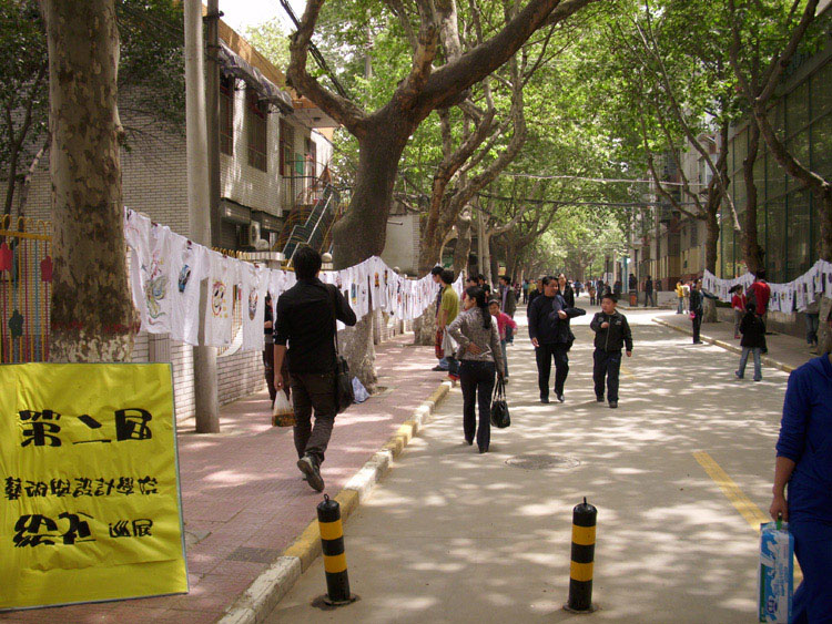 一件件精致的绘衫作品在主干道上形成了亮丽的风景线,吸引了过往师生的眼球。创新的手法,夸张的造型,富有青春气息的绘衫让众多同学和老师纷纷驻足拍照留恋,连小朋友们都忍不住好奇,伸出小手想“一探虚实”,看看是不是印上去的效果!?