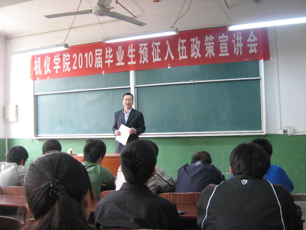本报讯 4月29日下午4点,机仪学院在教1-230召开了2010届毕业生预征入伍政策宣讲会。机仪学院党委副书记、副院长邢凯老师,毕业班辅导员王伟、蔡小薇老师出席了本次会议,会议由王伟老师主持。