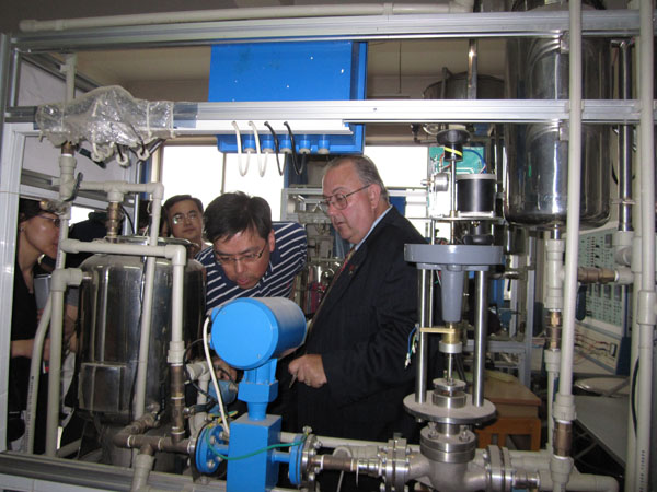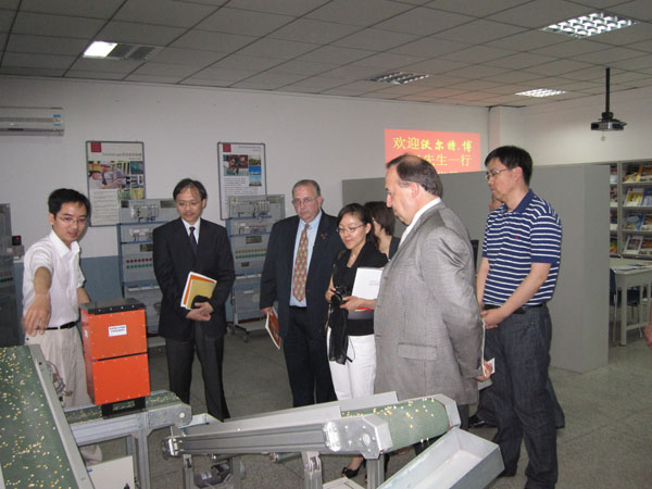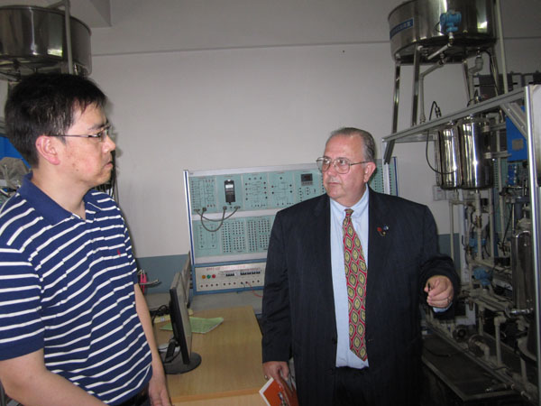 WALT BOYES一行首先来到我校与美国罗克韦尔自动化公司共建的西安理工大学罗克韦尔自动化实验室进行了考察,自动化学院副院长刘涵教授对我校罗克韦尔实验室的建设和运行情况作了简单介绍。WALT BOYES先生饶有兴趣的听取了相关介绍,并对罗克韦尔自动化实验室所采用的高端自动化设备表示赞赏,对实验室在工程实践性教学中发挥的作用表示认可。随后WALT BOYES先生来到信控实验中心过程控制实验室,就我校过程控制实验采用的设备及目前的技术发展进行了探讨。之后WALT BOYES一行考察了晶体生长设备及系统集成国家地方联合工程研究中心,参观了目前中心承担的国家科技重大专项“300mm硅单晶直拉生长装备的开发”项目,与中心技术人员就自动化技术在单晶炉拉晶控制中的应用进行了交流,对我校在此研究领域的控制技术水平和取得的研究成果表示赞赏。