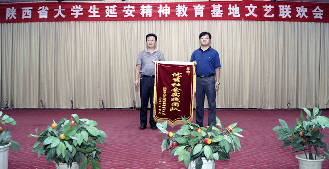 我校组织200余名学生骨干到延安开展“红色之旅”社会实践暨延安精神学习活动7月下旬圆满结束。陕西省大学生延安精神教育基地办公室主任、延安大学团委书记姜庆为我校大学生社会实践团颁发了“优秀社会实践团”锦旗。