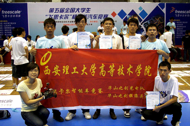 本报讯 第五届“飞思卡尔”杯全国大学生智能车竞赛西部赛区比赛于2010年7月24日至28日在成都电子科技大学举行,我校高等技术学院两支队伍参赛,是西部赛区45所高校、212支参赛队伍中的唯一的高职院校代表队。华山之剑之摄像头队(队员:张军哲、贾征、王亮,指导教师:赵红毅、梁阁亭)取得了决赛第13名、西部赛区二等奖;华山之剑之光电队(队员:朱小波、鄢胜兵、张楠,指导教师:赵红毅、刘战国)获得西部赛区优秀奖。
