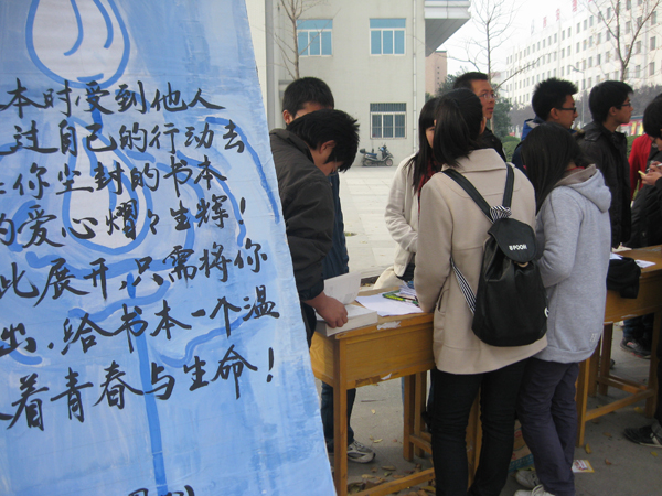 活动中,大二、大三的学生党员、入党积极分子、学生会成员带头积极响应号召,踊跃的拿出了自己用过的教参或看过的杂志、书籍前来捐赠。本次活动所捐书目分为暂捐书和长捐书两类。在本人捐书前按个人意愿登记备案,由学习部捐借书小组统一收录。暂借书可在捐书前注明捐书期限,到期予以退还;长捐书将不予退还,收入后由小组统一整理、编号,存入可借书书类当中,用以在日后的借书活动中恰当的使用。本次活动共捐书籍两百余册,同学们献出的爱心既为需要借书的同学提供了方便,也是资源重复利用的最有力支持。