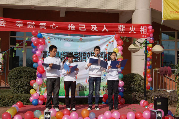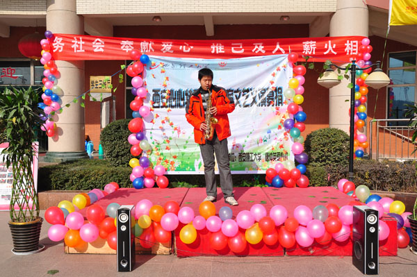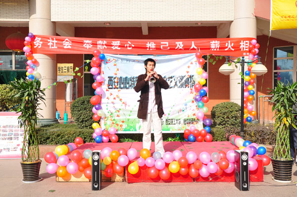 活动开始之前已经有很多同学驻足这里,伴随着一组激情四射的开场舞表演,慈善义演募捐活动正式拉开序幕。在主持人介绍活动背景后,唐仲英爱心社的八名同学为大家带来了第一个节目--手语表演《爱在心中》顿时全场安静,同学们都用心感受那爱的真啼。接下来的器乐表演则慢慢吹散伤感迎来欢乐;由党克舒同学为大家带来的猜扑克牌和手机进瓶的两个魔术,更是赢得同学们一片尖叫和热烈掌声,现场气氛轻松和谐;洋溢着青春气息的双截棍表演,则把同学们的激情推向了高潮,同学们的掌声连连。在背景音乐“在见警察”的旋律下,诗歌朗诵《爱的旋律》把活动再次推向了高潮。募捐活动开始,同学们排队依次从募捐箱前经过,向里面投进了自己的一份爱心。正如一位参与献爱心的同学说到,尽自己所能去帮助哪些需要帮助的人。而且来自西安歌友会的同志也向募捐箱献出了自己的一份爱心。随后他们也为我们带来了精彩的节目表演。最后,由来自心心特殊中心的两名老师带着两名儿童代表上台就本次活动向同学们表示了深的谢意并向现场同学们深深鞠了一躬!
