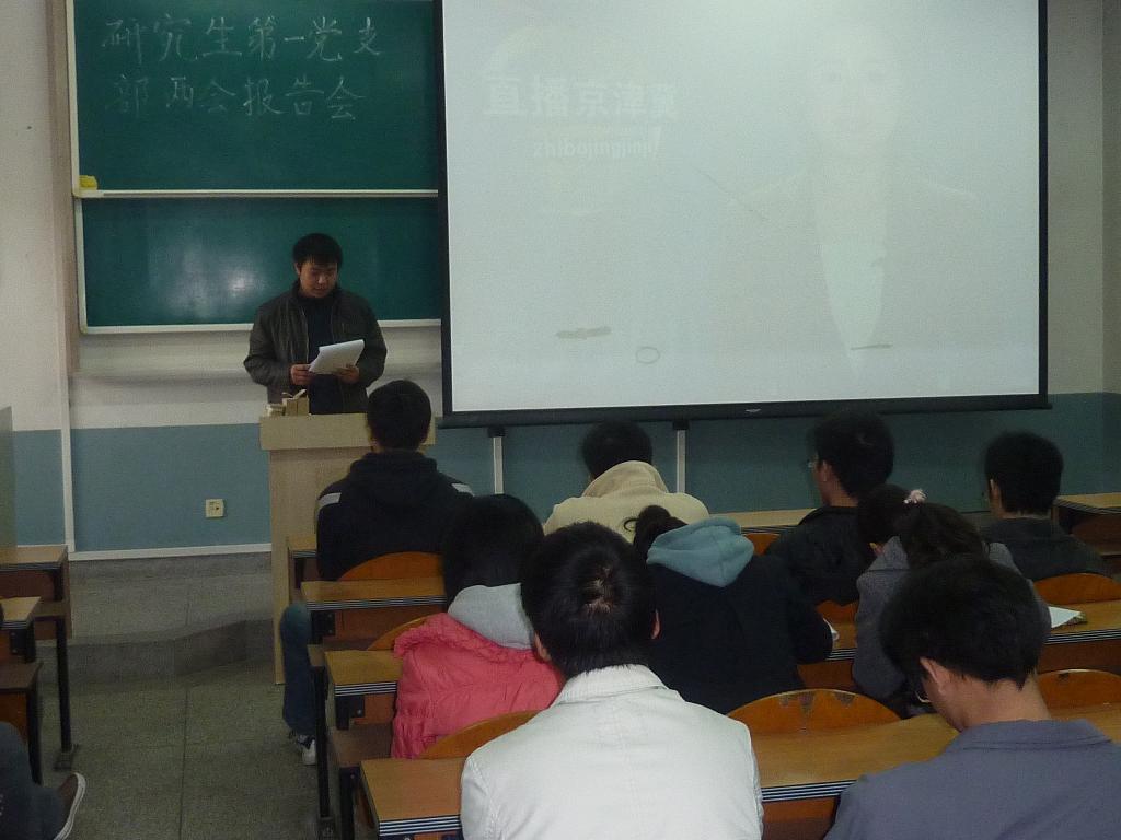 本报讯 2011年3月16日下午3点,机仪学院研究生一支部在教6—210召开了以“学习‘两会’精神,发扬时代先锋” 为主题的会议,会议中党员通过观看“两会”相关视频、分组陈述、即兴演讲等方式学习两会精神。