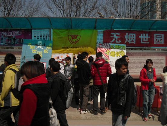 本报讯 3月15日中午12点,我校唐仲英爱心社在曲江校区主干道举办“无烟世园 无烟校园”活动。