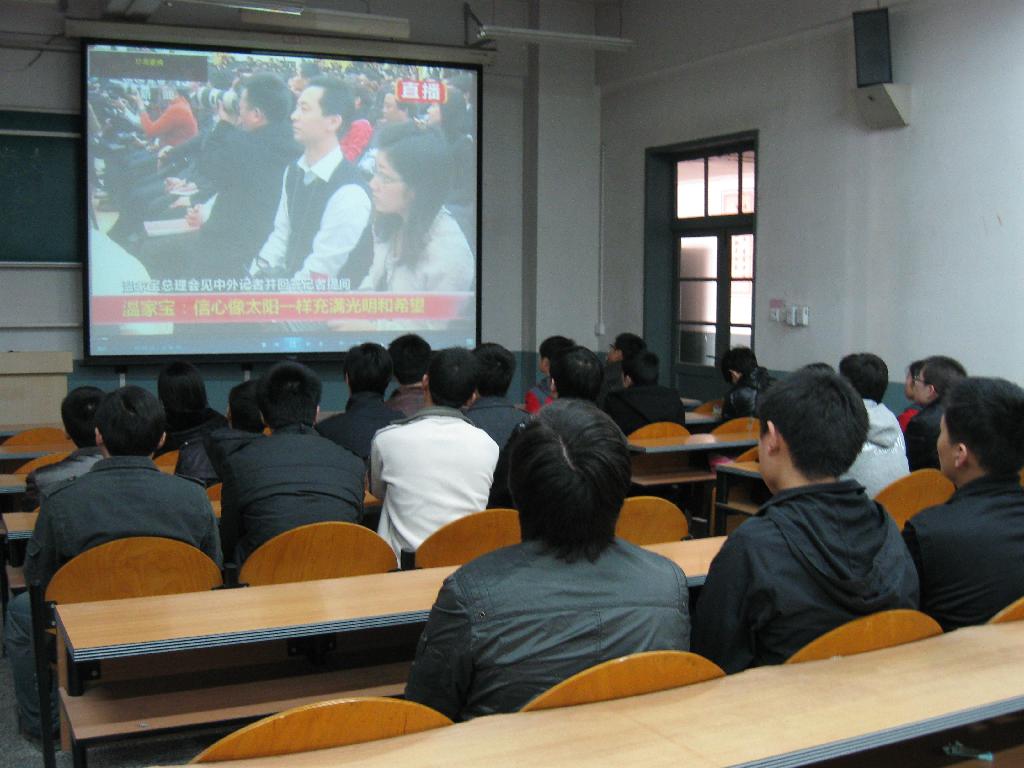 首先是个人发言,大家分别从自己所关注的问题出发,学习了相关政策同时发表自己的见解,其中谈及了教育、农民、医疗、文化、就业等各个方面的问题,表达了自己对“两会”的关注和对民生的关注。其次是集体观看视频,大家一起观看了时间长达一个半小时的温总理答记者问视频,重温了“两会”热点问题。之后大家充分结合了前两个环节自己的收获理解,热情全面地展开了讨论。很多同志的发言视角独特,理解深刻,见解独到,让大家收获不少。最后在热烈的掌声中,本次活动圆满结束。