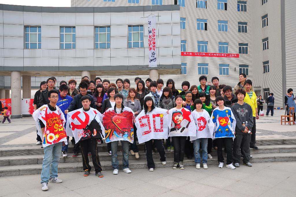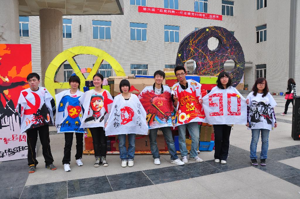 本届涂鸦秀创意新颖,特色鲜明,以一架自制“摄影机”为开端,采用老胶片的形式,展映了建党90周年以来的红色故事和精彩瞬间。在激情豪迈的红歌声中,涂鸦秀拉开了帷幕。在四十米长的白色画布前站满了来自不同大一不同的班级的参赛选手们,,他们手拿画笔激情澎湃的在画布上挥舞着,时而小心翼翼,时而挥洒自如……用他们自己的方式诠释对党的无限热爱之情和对党的祝福。经过一个多小时的努力,一幅幅红色画面在画笔的勾勒下渐渐展现出来。耀眼的中国红映照着革命先烈的英雄事迹展现在眼前,深刻表达了同学们对党的热爱。他们的涂鸦作品使评委及观众们看着无不叫好称赞。活动过程中,三位老教师对同学们的绘画功底和独特创意给予了充分肯定,并对同学们的作品进行了一一点评,鼓励同学们不断发扬团结合作的精神,永远充满朝气蓬勃的活力。同学们都虚心得聆听着,此时的他们脸上手上都沾满了颜料,欣慰的笑容挂满了每个同学的脸庞,祖国的花朵都充满着朝气与活力。 活动在欢声笑语的合影中圆满落下帷幕。同学们踏着晚霞的光影渐渐远去,但他们的朝气仍然留在了空气中。