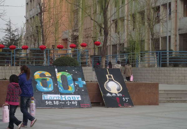 活动现场气氛异常热烈,活动现场周围挂满了各式各样的灯笼,这些灯笼都是由学生们自己手工制作,以此来倡导资源的重复利用。活动现场的右侧用灯笼摆出一个“60+”的标志,当烛光亮起时,一排排字便呈现在同学们的眼前,这些灯笼上都有镂空的文字,内容是:“迎长安世园,促天人和谐”之地球一小时活动欢迎您的参与。用灯笼来替代横幅不仅起到了节约资源的作用,而且宣传效果显著,可谓一举两得。灯笼上还设置了环保灯谜,这些灯谜更加激发了同学们参与活动的热情,与此同时同学们的环保知识也在无形中得到了提高。