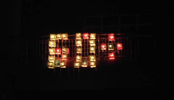 于八点三十分我们的“送灯”活动也圆满结束 。在五号宿舍楼的南面可以看到一些宿舍的阳台上挂着大红灯笼,细看之下就可以发现是一个大型的“60+”标志。