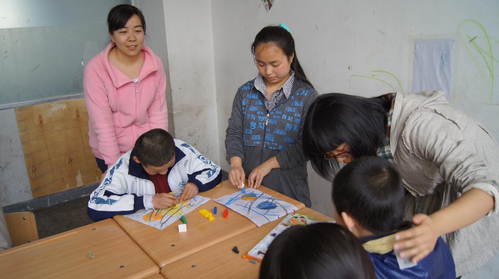 在互动过程中,同学们尽量地教小朋友们学一些简单的手势,认一些简单的图形,或者只是反复地教他们说一声你好,普通孩子很轻松就能做到的事情,他们也许永远也学不会,但是孩子们努力学习的样子却让人感动而心酸。对于一些孩子情况稍好孩子,同学们会给他们讲一些小故事,他们听到开心处会手舞足蹈,发出一些也许让人有些诧异的声音,但这最原始的笑声就是他们心情的流露,也是他们快乐的表达。