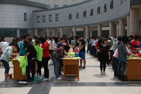 本报讯 4月15日,艺术与设计学院在曲江逸夫科技馆前举办了“运动激情我参与,绿色世园共建设”百人共绘T恤衫活动。