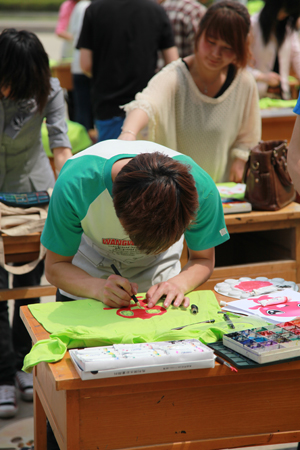 学院为每位参与的同学分发了一件绿色T恤衫,由同学们自选材料进行绘图。为响应2011年西安世界园艺博览会的召开,本次绘衫秀要求以世园会标志为内容,每件T恤的背面画有各个表情的长安花,前面的图案则由同学自行选择花卉的一种,借此呼应世园会的主题。