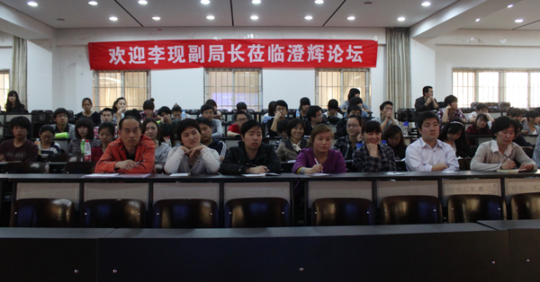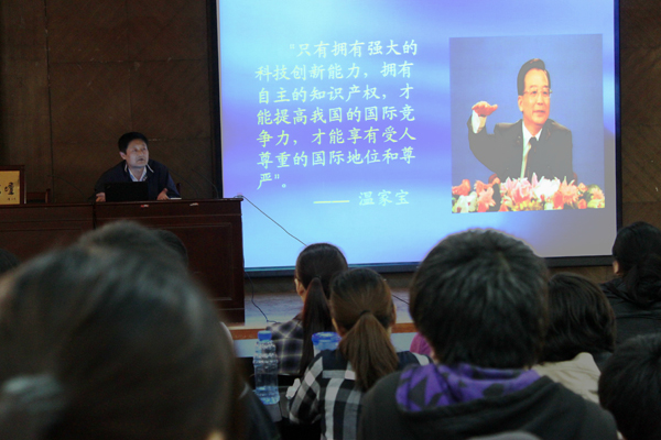 本报讯 4月15日,在第十一个世界知识产权日(4月26日)来临之际,西安市知识产权局副局长李现先生莅临澄辉论坛,针对知识产权问题在我校人文与外国语学院模拟法庭进行演讲,我校艺术与设计学院工业设计系和摄影系同学到场听讲。