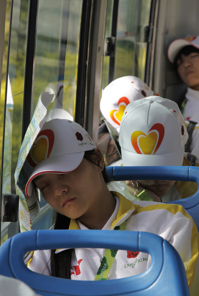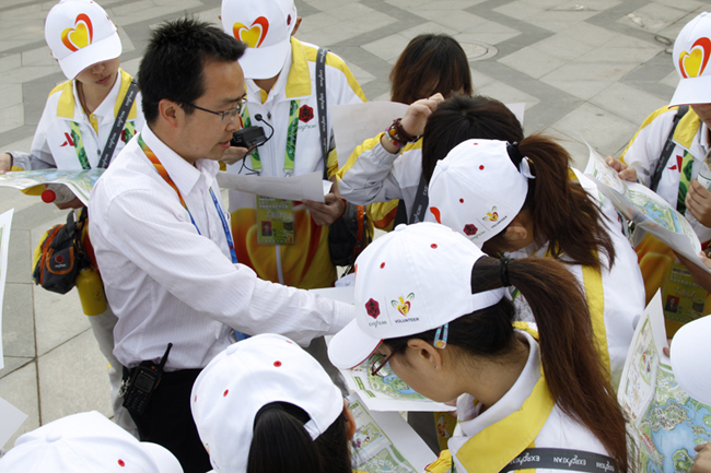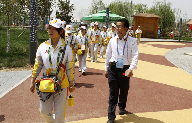 2011西安世园会坐落在浐灞之滨,其中广运潭为园中的主会址。24日早7点,艺术与设计学院志愿者从曲江校区奔赴世园会,从3号入口(次入口)进入园区,开始一天的熟悉世园活动。由于前期已经分好组,11名同学分别前往5个小组,由各个工作人员分批带领去了解自己的岗位和世园会的标志性建筑,接受相关的岗前培训,为世园会28日的开园做充分准备。