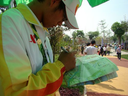 何华是E41组的组长,人特别能说的他被其他同学赋予了“快嘴”的称号。能说的他干起活来也毫不含糊,站在上海园前守住自己的阵地,有游客前来询问时便热情的服务,没有人询问时便在手中的地图上勾勾画画。“我自己把游客爱问的一些地点用笔标记出来,这样更明显,能更加清晰明了的向游客说明”,何华这样向记者说道,“比如有人问哪里有买电池的,我就向他们推荐广场那边的超市,在地图上注明出来,免得游客找不到路”。我们的“快嘴”之所以能迅速的为游客指明道路靠的就是这种一丝不苟的认真态度。