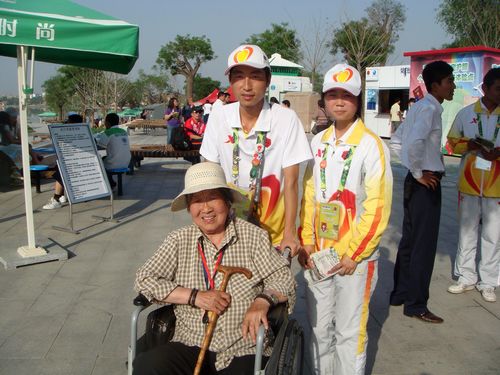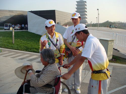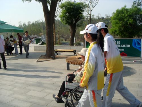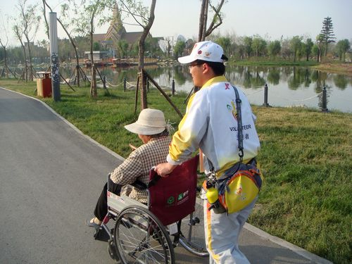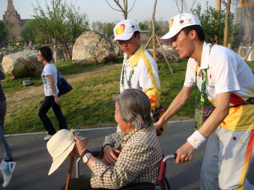 2011年5月4日下午,雷淑莲老人只身一人乘坐公交来到世园会游玩。由于老人腿脚不便,再加上天气炎热,老人很快就体力不支了。在广运门处服务的志愿者发现此情况,立刻亲自带老人来到物品租赁处租了轮椅,并开始轮流陪同老人在A区游览。老人在志愿者的陪同下游览了省内馆,由于志愿者们还有自己要执勤的地方,所以每到一处就换另外一个志愿者推着老人的轮椅,这样形成了一个庞大的爱心接力。在A区的志愿者陪同老人游园过后, E区的志愿者了解了情况后紧跟爱心步伐,主动接过老人,带着老人在E区游览观光。就这样,从A区到E区到D区到C区,所有片区的志愿者们都主动帮助起这位老人,全程陪同她游览了这个世园区。