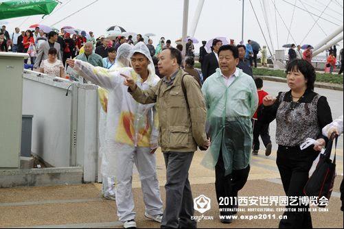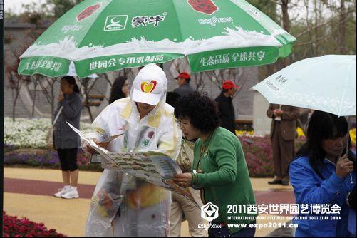 志愿者在雨中为游客讲解游览路线