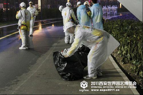 志愿者在雨中认真工作