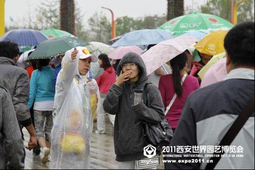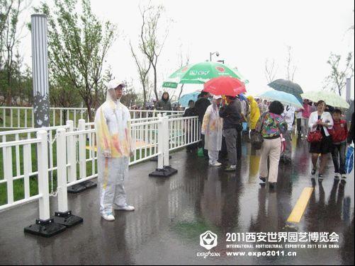 志愿者在雨中为游客指引道路