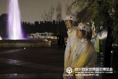志愿者在雨中站岗