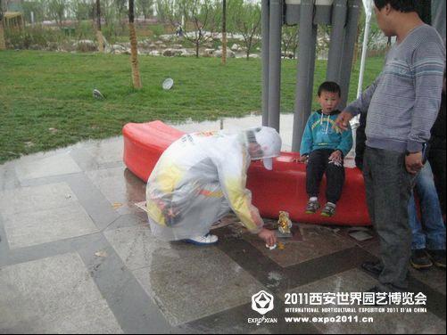 志愿者在雨中坚守岗位