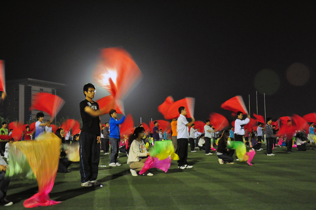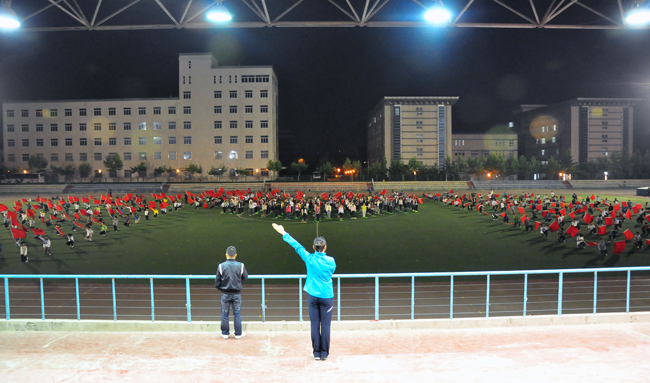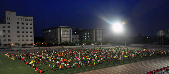 经过两个多月的排练,800名同学的共同努力,5月15日下午7点30分,第一次彩排在曲江校区操场顺利进行。红旗飘扬,长绸飞舞,激昂的音乐振奋了在场每个人的心。