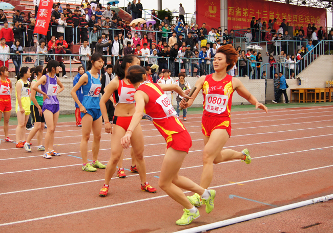 5月21日下午,雨。陕西省第三十三届大学生田径运动会在我校曲江校区先后举行了A甲女子组4×400米接力决赛和A甲男子组4×400米接力决赛,我校均获冠军。