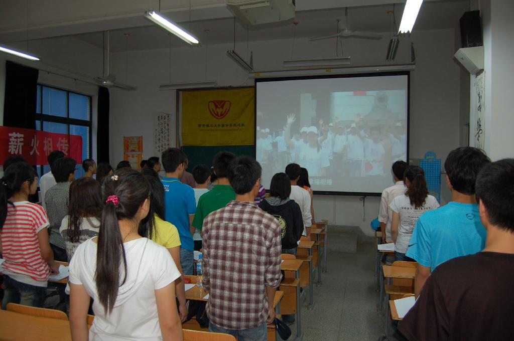 之后,爱心社社长刘翅莉讲话,他激情洋溢的谈吐将会场气氛推向了高潮。他详细介绍了爱心社的活动,支教,心心幼儿园,临潼聋哑学校,文艺下乡,交流会,素质拓展,红凤活动等等,并播放了近期活动的PPT,让新社员更近一步的了解了爱心社。