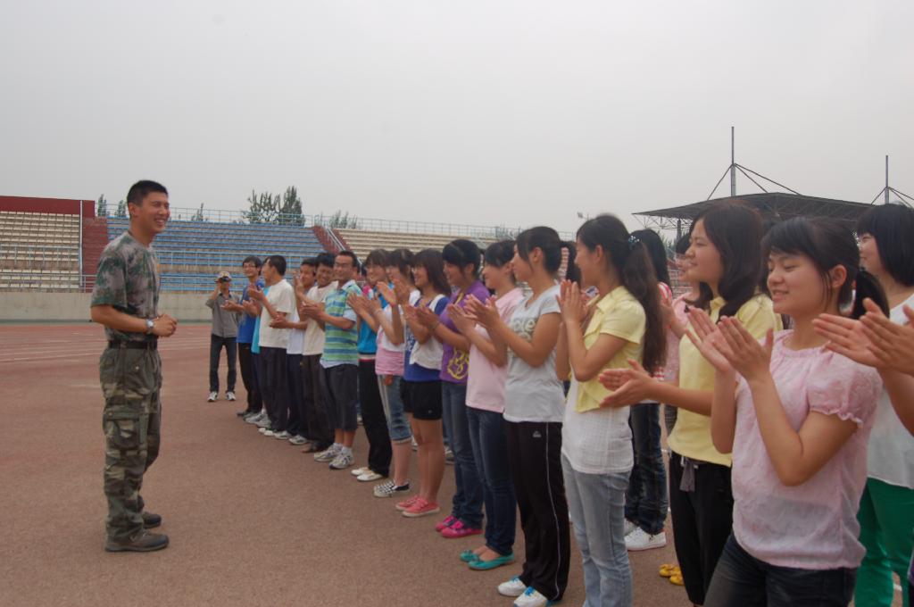 第一个活动是由教官严老师为我们指导。我们按1、2,1、2,1、2……循环进行报数,分成两个队伍,1号队和2号队。教官给了我们十分钟的时间让每个队为自己定下队名,队号,队歌。一号队取名为烽火群狼队,队号是“齐心协力,勇登高峰”,队歌为:水手。二号队则是闪电队,喊着“闪电闪电,奋勇前进”的口号,唱着“奔跑”的队歌,气势非凡。接下来,我们开始了第一项任务:如何让队员的掌声合并为一个掌声。刚开始训练时,每个队12名队员的掌声那可是层差不齐,一个时间段就有12种掌声。不过,在队长的带领下,大家相互讨论,最后大家达到了共识,闭上眼睛,保持清静,心里数着数字,跟着节奏走。很明显,效果很好。最后两队打成了平手,实力相当。在这么多人的鼓掌当中,要想只能听见一个掌声,并非易事,那是需要大家的沟通,大家的团结,大家的信任才可能实现的。