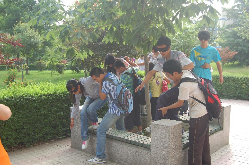 第三个活动是哑巴盲人活动。充当盲人的同学戴上了眼罩,他们先前根本不知道照顾他们的哑巴会是谁。哑巴与盲人组成了一个团队,在行进的过程中他们遇到了很多障碍,爬栏杆、钻地洞,走楼梯等,但是大家都一一克服了,哑巴把盲人照顾得很好。因为他们心中有着一份责任,就是好好照顾自己身边的盲人朋友,不要让他受到一点点的伤害。到达目的地后,盲人摘下眼罩,开始寻找照顾他们的哑巴朋友,只不过短短二十几分钟的照顾,他们能找到吗?然而,不久就听到了一阵阵吵闹声,有感动的哭泣声,有一起回忆的欢笑声……原来彼此的相互信任是多么的重要,有了这种信任,再大的困难最后都会迎刃而解。