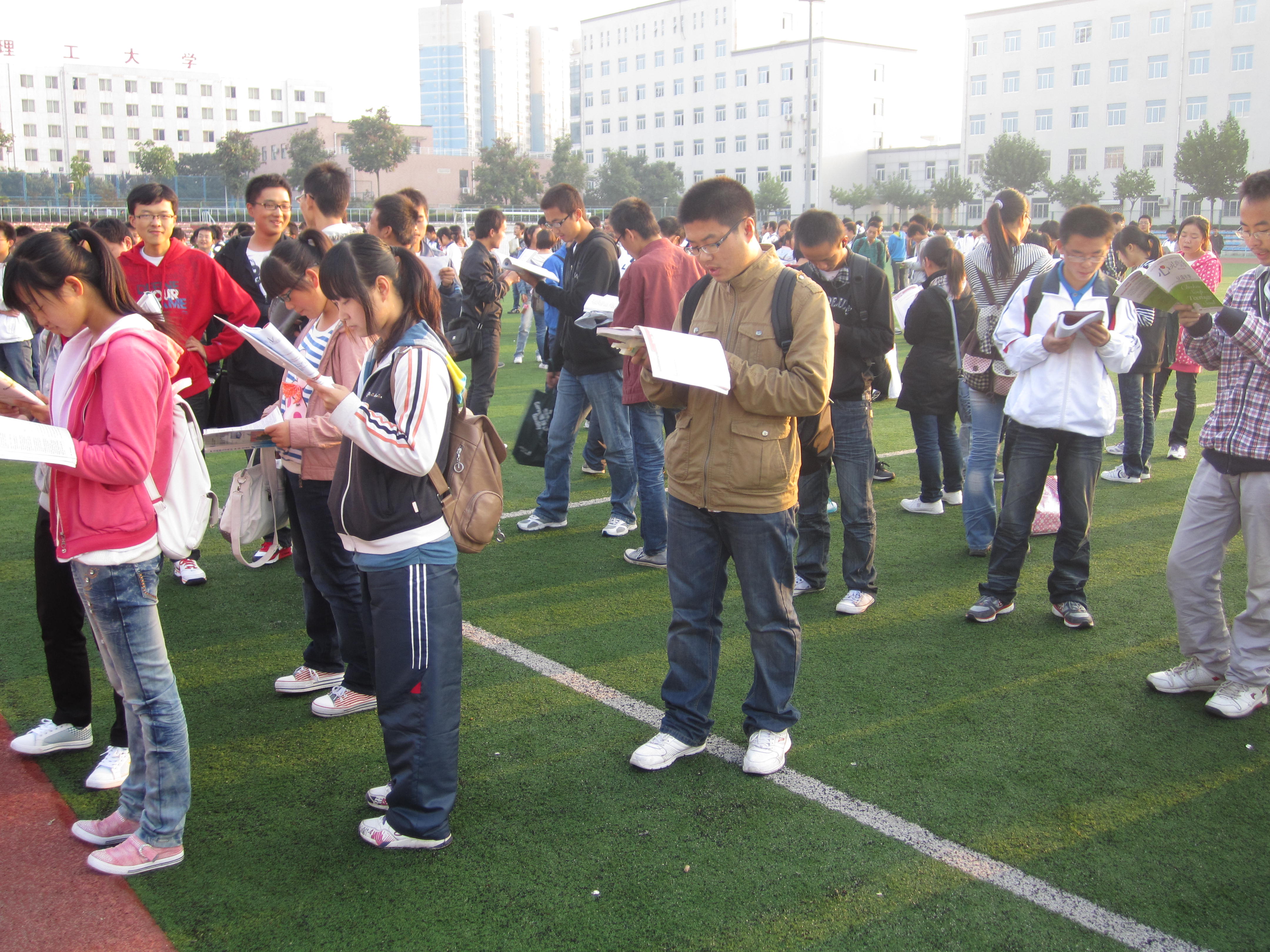 早上七时,各班同学在班长和学习委员的带领下,早早的来到了曲江操场,在领取了学习部发给大家的英语阅读材料之后,在学习部特地邀请的广播台英文部的领读人鼓舞人心的引导之下,大家很快的进入了状态,跟着领读人大声的读了起来。晨读期间,学习部的干事主动为阅读有困难的同学提供帮助,并维持了现场的秩序,使晨读活动有序进行。