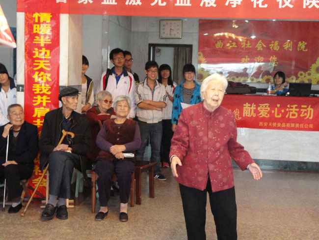 四位大一女生为老人们真情献上的“阳光总在风雨后”为这次的活动拉开了帷幕。活动中,各位同学都各展才艺,为老人们献上了自己精心准备的曲艺表演,博得了老人们的阵阵欢笑。现场气氛高潮阵阵,吸引了各位老人们也都上场为大家表演了自己拿手好戏,精彩的表演更是让现场高潮迭出。在才艺表演过后,是绿窗协会的同学们精心策划的抽奖互动游戏。抽奖互动游戏让老人们和同学们融入到了一起,真正实现了老人们与同学们的互动,达到了互动交流的目的。