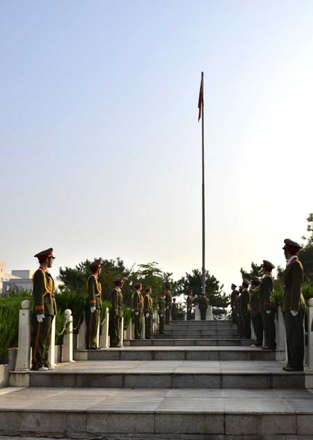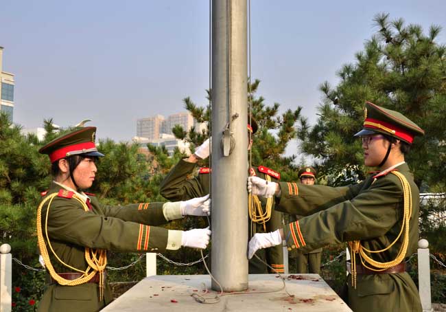 伴着朝阳,国旗护卫队的同学们迈着有力的步伐,手捧鲜艳的五星红旗向升降台走去。国歌声响起,队员一声令下敬军礼目送它飘扬在理工大的上空,整个升国旗庄严肃穆体现了理工大学子强烈的爱国情怀。