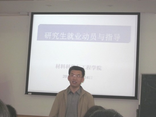 首先,李均明副院长结合近年材料学院的研究生就业情况和当前就业形势,科学地分析了用人单位的分类及其对毕业生的素质要求,希望广大同学积极做好就业的相关准备工作,不要拘泥于自己所作学位论文的小范围,而是在应聘时充分体现自己硕士阶段培养的科研能力,放宽选择范围,合理自我定位,争取签到一份满意的工作。