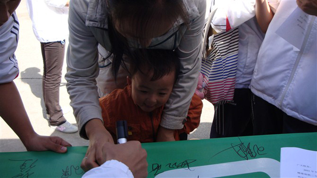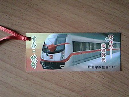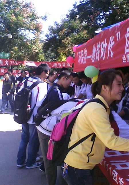 10月13日上午10点,在曲江校区的主干道上,信管111班30名同学开始了主题为“环保控—地铁时代”的宣传活动。他们通过宣传单、照片等资料宣传关于地铁开通情况,为学校的莘莘学子带来了大量的一线资料。之后又举办了“绿色出行,从我做起”的签字活动,三四百同学踊跃参与,信管111班的同学们把自己设计的书签赠给了签字的同学。