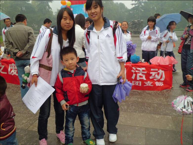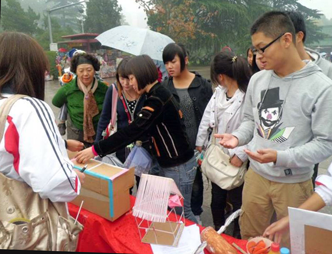 中午下起了小雨,同学们将展出的工艺品赠送给了参加活动的小朋友们,并与他们拍照留念。