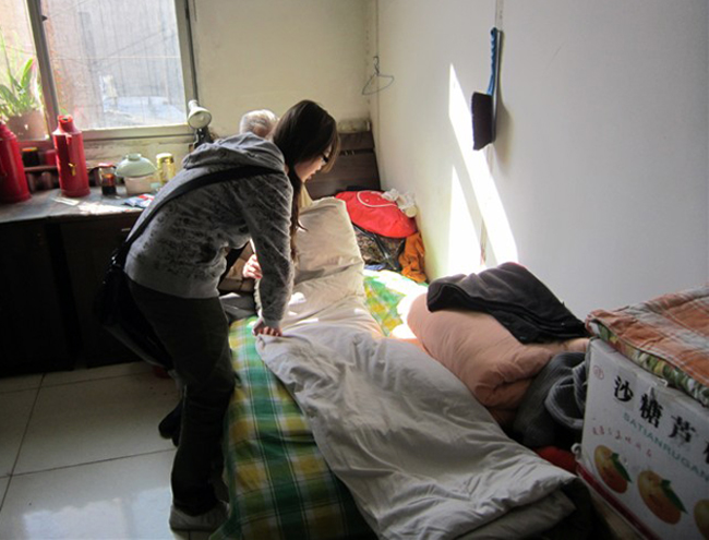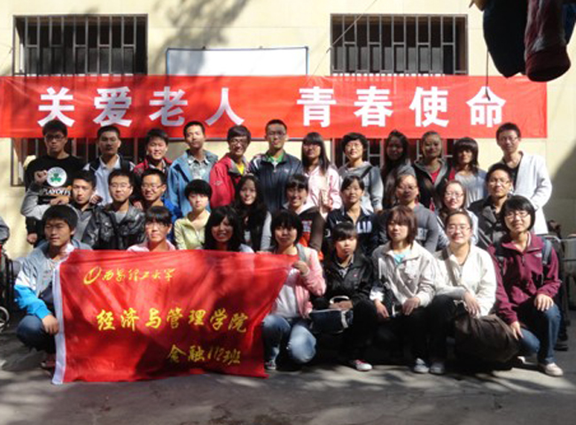 金融112班同学来到莲湖区光明巷58号的“福星”老人公寓,为敬老院老人们带去了水果点心,并为老人们表演了红歌、民歌、秦腔、京剧等节目,同时与老人们交谈,了解他们生活的困难和自身的愿望,为老人们的生活带来了很多欢乐。之后,同学们全体出动,为敬老院打扫卫生,并扶老人们户外散步晒太阳。临走之时,和全院老人合影留念。