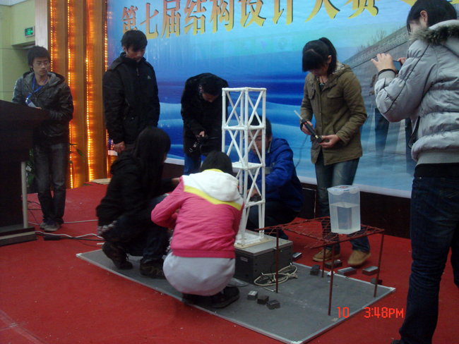 本届结构设计大赛分为答辩、加载和模拟汶川地震波三大部分。我校土木建筑工程学院3只代表队在专业老师的指导下,严格按照比赛要求制作,每天认真地投入到作品的制作中,并利用所学知识不断完善作品。最终,我校3支代表队全部获得优秀奖。其中,在模拟汶川地震波环节中,由土木101班雍馨、黄麒、李雪艳组成的西安理工大学第二代表队所做作品达到了全部作品中地震波频率最高值,收到了全场观众的热烈掌声和专家评委的高度评价。