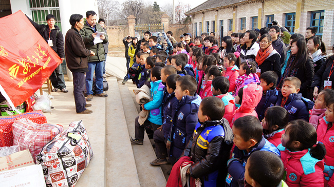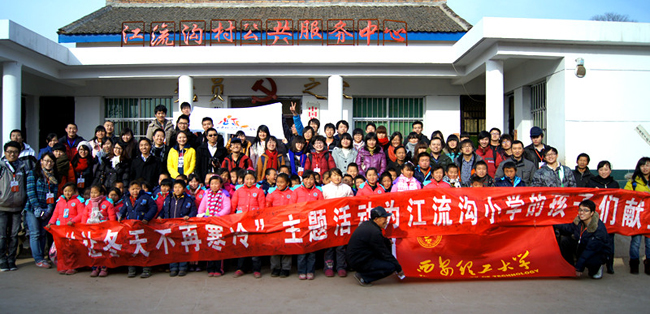 本报讯 12月12日上午11点,在我校团委的带领下,由中国移动、江铃汽车公司与我校学生会、经济与管理学院互助社组成的爱心团队驱车前往位于蓝田县偏僻山区的厚镇乡江流沟小学,为孩子们带去了御寒物资,也送去了寒冬的问候。