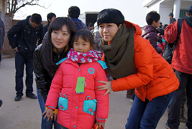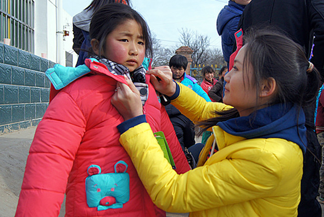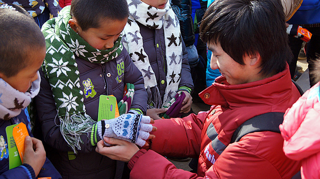 爱心团队的成员们很快将爱心物资拿了出来,长长的桌子上摆满了各色的书籍、衣服、书包、笔以及御寒的衣服。不过最吸引人的还是各色的衣物,包括棉衣、棉裤、围巾、手套、袜子等等,样样俱全。充满爱心的我校志愿者们争着为孩子们穿上漂亮的衣服,场面甚是热闹。 据负责活动的李博老师介绍,爱心团队为孩子们带来了新棉衣52件、新棉袜52双、新围巾48条、新帽子4顶、半成新的衣物600件、文具5箱、杂志书籍5箱、床单被褥3袋、防寒物品4袋,以及生活物品5箱。领到东西的孩子们兴高采烈,争着和志愿者们合影。