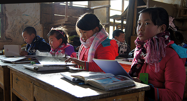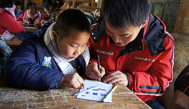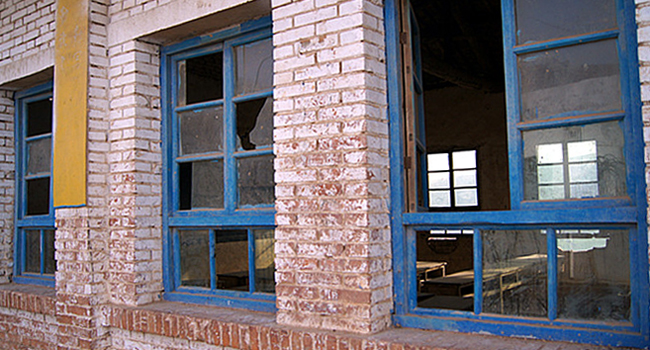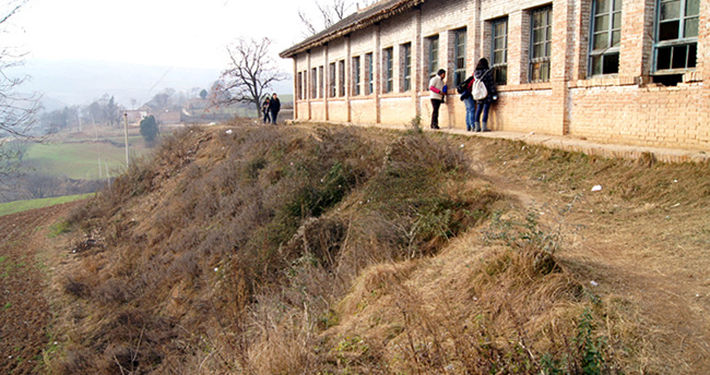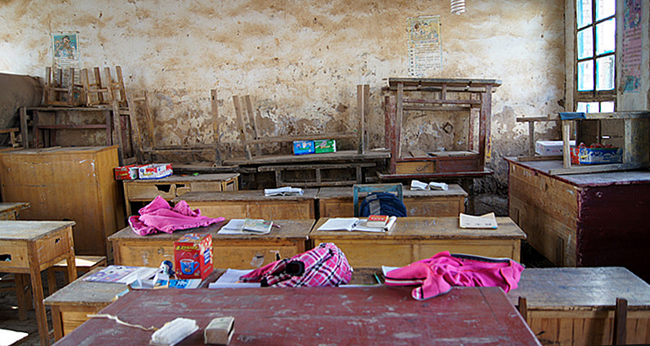 江流沟小学是一所完全小学,现有学生50名,教师——包括校长在内4名。由土坯和砖瓦修筑的校舍经过26年的风蚀,已经破败不堪了。由于漏雨漏风严重,所有学生不得不挤在一间教室里,进行“复式”教学。记者观察到,教室的窗玻璃缺失很多,为防止漏风不得不用砖块和木板堵上;校舍内堆放着残破不齐的旧桌椅,墙壁的裂缝随处可见。据贺校长和老师的介绍,来这里上学的基本是住在附近的农家子弟,家境都比较贫困。尽管教学、生活很苦,但孩子们却表现得很乐观,乐意和大家交流。